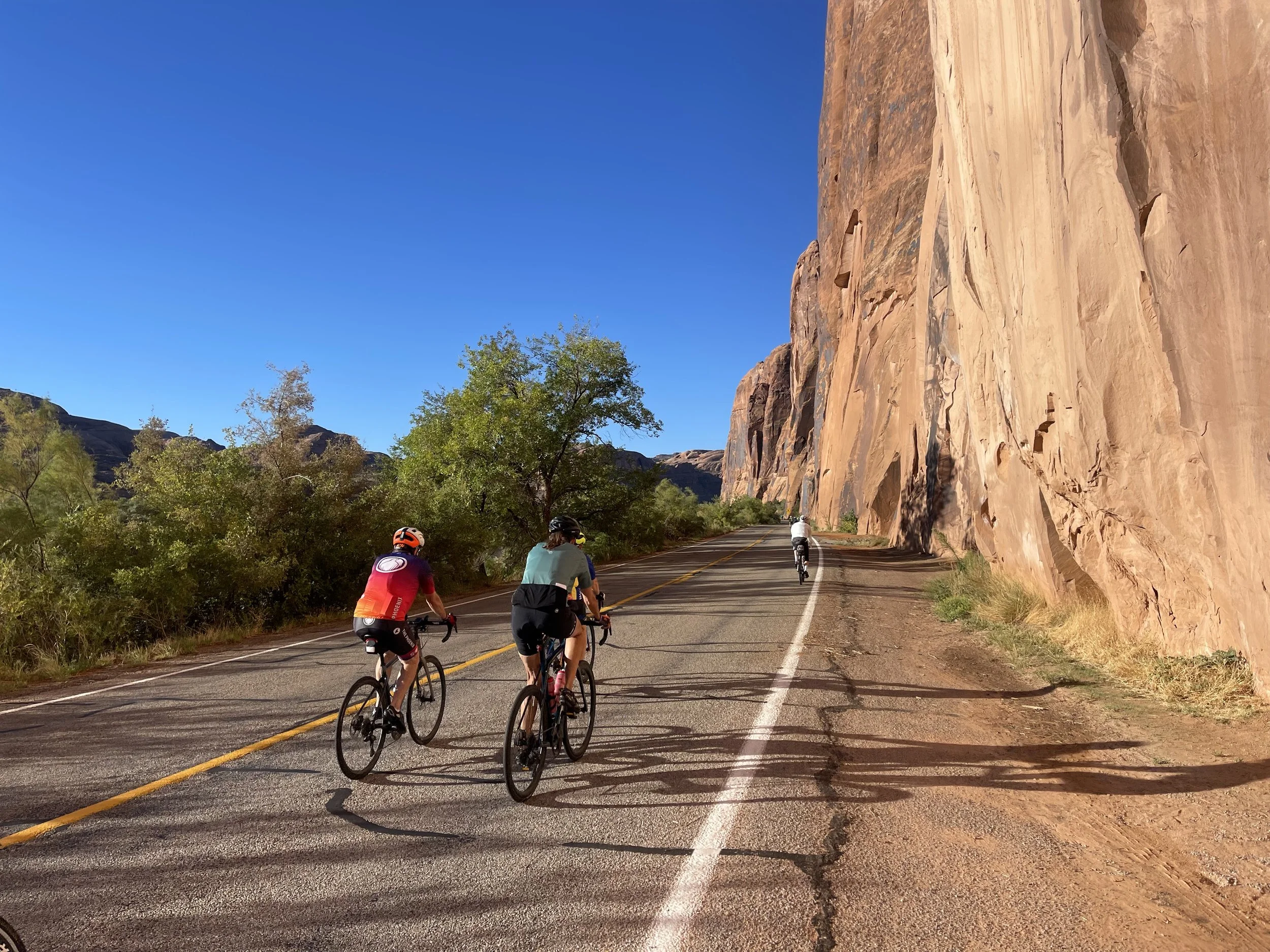 Lunch: Provided post route.Highway 279 is a favorite among local roadies because of its unbroken cadence. After passing through "The Portal," the Colorado River begins its cut through the impressive sandstone. The road meanders alongside the tranquil river and maintains a flat profile through some of the most astounding topography imaginable. Red rock walls rise hundreds of feet straight up from the shoulder of the road as it cuts tightly along the river. For miles, you'll spot rock climbers on the infamous “Wallstreet” and cycle past 1,000-year-old Anasazi petroglyphs carved in the ancient rock wall.